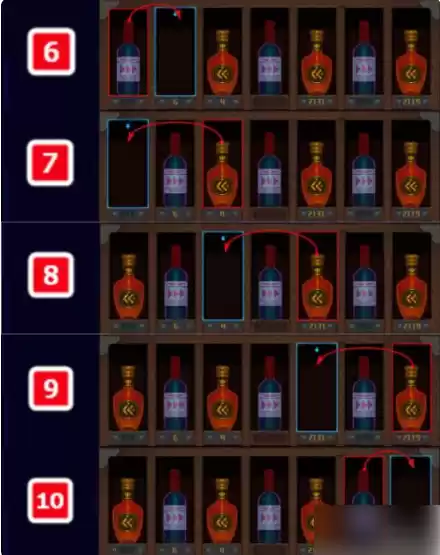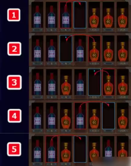 解谜跳法如下图,以标注的数字顺序为步骤,依照箭头的指引移动瓶子。