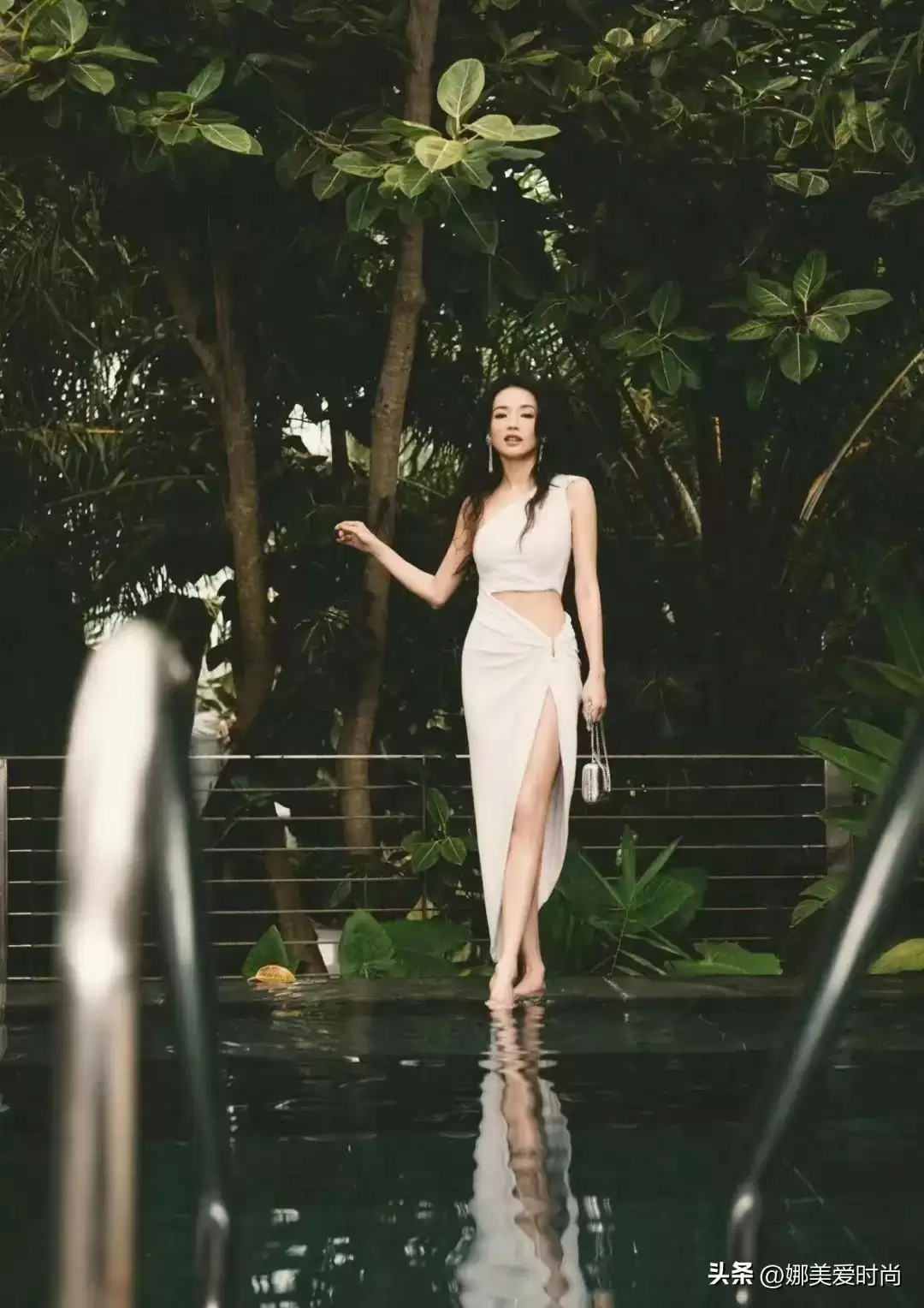舒淇的这套白色长裙,展现出她干净的气质。裙子的设计非常独特,上半身是干练的西装款式,与裙身的走向形成流畅的线条。西装的收腰部分为她塑形,深V领口延伸到胸部,效果满分。下半身的裙子略微拖地,裙身开叉设计让她的双腿若隐若现,展现出妩媚动人的风姿。裙子从膝盖以下采用轻羽毛款装扮,增添了一份独特的美感。整体来看,上半身的干练与下半身的优雅完美结合,没有任何违和感。当然,这样的裙子也需要舒淇的高挑身材和完美身形来驾驭,裙子只是起到衬托作用。