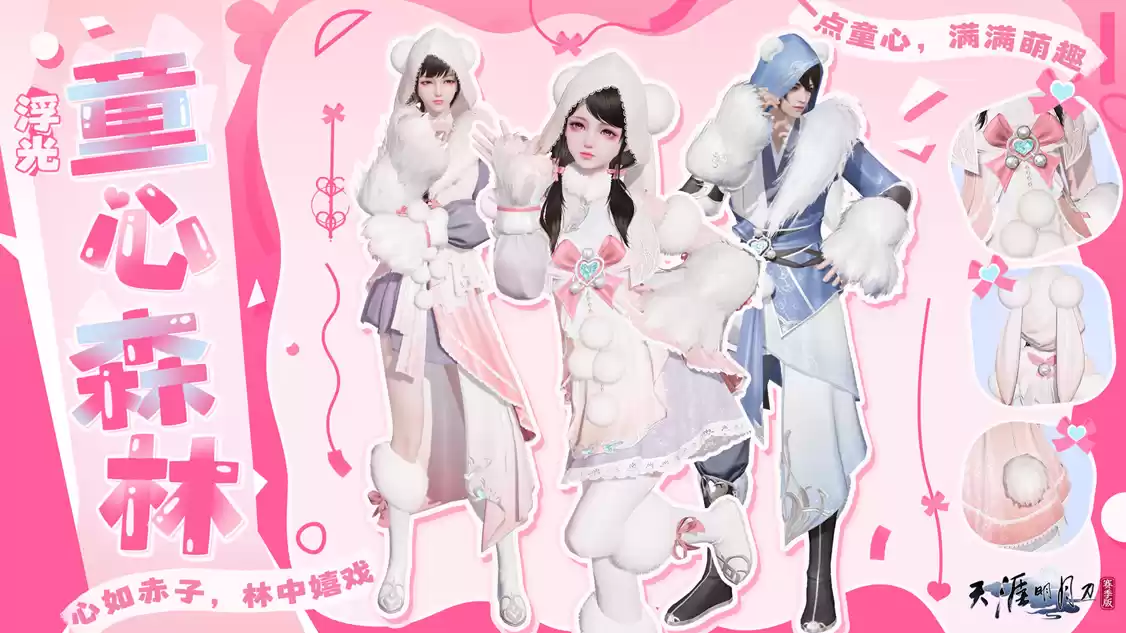 一点童心,满满萌趣!伴随着夏日的到来,首先将随6月12日版本登陆商城的是浮光系列主题外观【浮光·童心森林】,售价1580月灵石。可爱甜心,亲密加倍,穿着温暖毛绒搭配甜蜜饰品和你开启甜蜜之旅!