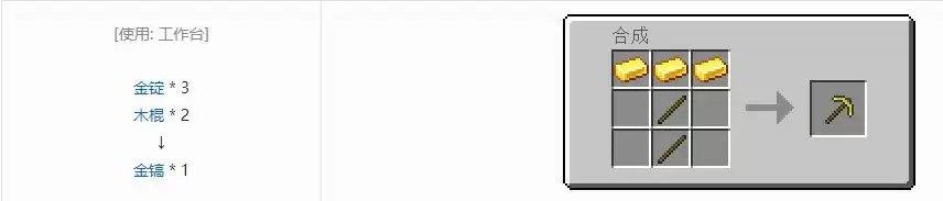 我的世界游戏里面的金镐合成方法:需要材料3个金锭+2个木棍可以获得1个金镐,只能挖掘石头、煤矿石/制品以及混凝土、部分石制方块,还是耐久最低的挖掘工具,33点耐久甚至只有木镐的一半。