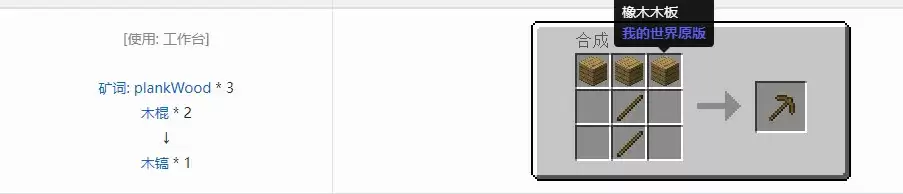 我的世界游戏里面的木镐合成方法:需要材料3个橡木木板+2个木棍可以获得1个木镐,可以挖掘石头、煤矿石/制品和所有混凝土、石制方块。