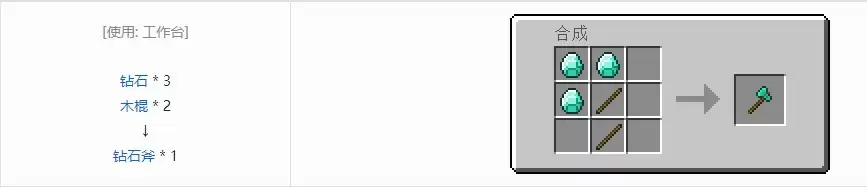 我的世界游戏里面的钻石斧合成方法:需要材料3个钻石+2个木棍可以获得1个钻石斧,原版第二耐用的斧,有整整1561点耐久,用于快速破坏木质方块。
