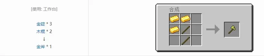 我的世界游戏里面的金斧合成方法:需要材料3个金锭+2个木棍可以获得1个金斧,用金锭做的斧,用来快速破坏木质方块,烧炼后产物为金粒。