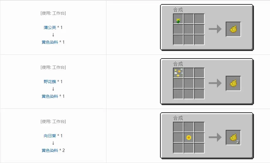 我的世界游戏里面的黄色染料合成方法:可使用蒲公英或向日葵合成,可用于合成混凝土粉末、烟火之星和陶瓦,是一种可以把物品染成黄色的染料。