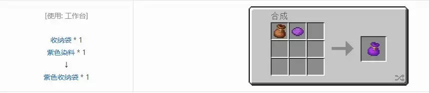 我的世界游戏里面的紫色收纳袋制作方法:需要材料1个收纳袋+1个紫色染料可以获得1个紫色收纳袋,收纳袋可以是除该颜色收纳袋外的任意颜色收纳袋。