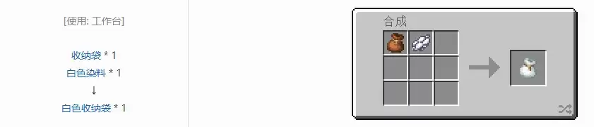 我的世界游戏里面的黑色收纳袋制作方法:需要材料1个收纳袋+1个黑色染料可以获得1个,收纳袋可以是除该颜色收纳袋外的任意颜色收纳袋。