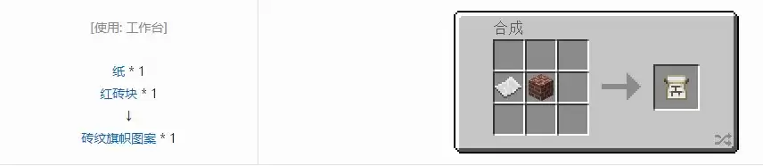 我的世界游戏里面的砖纹旗帜图案获得方法:1个纸+1个红砖块可以获得1个砖纹旗帜图案,旗帜图案必须与一个旗帜和染料结合,使用后不会消耗旗帜图案。
