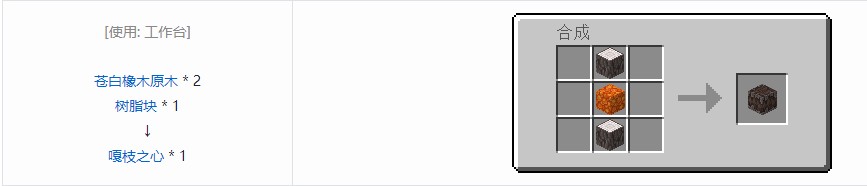 我的世界游戏里面的嘎枝之心合成方法:可使用苍白橡木原木和树脂块合成,使用有精准采集魔咒的工具采集会掉落本体,否则掉落1~3块树脂团(受时运影响)。