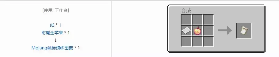 我的世界游戏里面的Mojang徽标旗帜图案制作方法:需要材料1个纸+1个附魔金苹果可以获得1个Mojang徽标旗帜图案,替代了原来在工作台上合成自定义旗帜的方式。