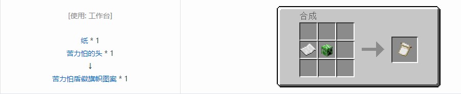 我的世界游戏里面的苦力怕盾徽旗帜图案:需要材料1个+1个苦力怕的头可以获得1个苦力怕盾徽旗帜图案,可以用于织布机中来将图案添加到旗帜上。