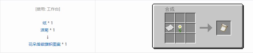 我的世界游戏里面的花朵盾徽旗帜图案制作方法:需要材料1个纸+1个滨菊可以获得1个花朵盾徽旗帜图案,是用于在织布机上自定义旗帜的物品。