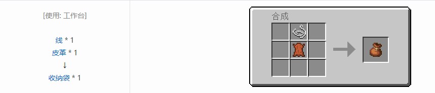 我的世界游戏里面的收纳袋合成方法:1个线+1个皮革可以获得1个收纳袋,是一种用于存储其他物品以便管理的物品,通过提示框来作为交互界面。