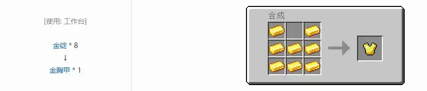 我的世界游戏里面的金胸甲合成方法:8个金锭可以获得1个金胸甲,穿上它,猪灵将视你为友好生物,如果你攻击猪灵,或者在猪灵旁边挖金块开/挖箱子,不管有没有穿着金盔甲,猪灵都会攻击你。