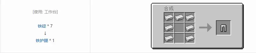 我的世界游戏里面的铁护腿所需铁块数量介绍:7个铁锭可以获得1个铁护腿,受到的伤害不再只受护甲值影响,还受伤害和盔甲韧性的影响,伤害越高,对防御能力的削弱越强。