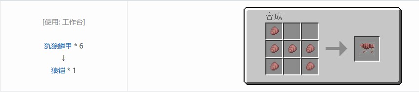 我的世界游戏里面的狼铠合成方法:6个犰狳鳞甲可以获得1个狼铠,是可以为狼装备的盔甲物品,于马铠作用类似,会为狼提供 11 点护甲值,并通过消耗自身耐久为狼抵消大多数的非魔法伤害。