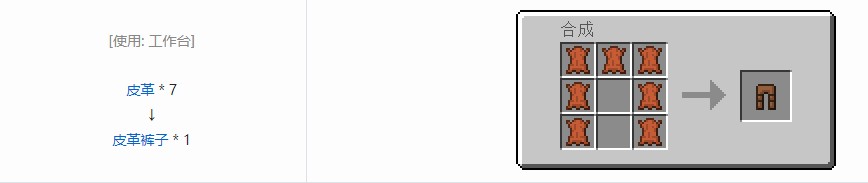 我的世界游戏里面的皮革裤子合成方法:7个皮革可以获得1个皮革裤子,可以用染料进行染色(仅Java版),也可以在装有染色的水的炼药锅中进行染色(仅基岩版),已染色的皮革装备可以在盛有水的炼药锅中洗去颜色。