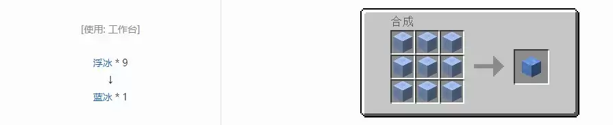 我的世界游戏里面的蓝冰制作方法:蓝冰可使用9个浮冰合成获得,每次合成时获得1个,蓝冰很滑,能使包括物品在内的大多数实体在他上面滑动,它甚至比冰或浮冰更滑。