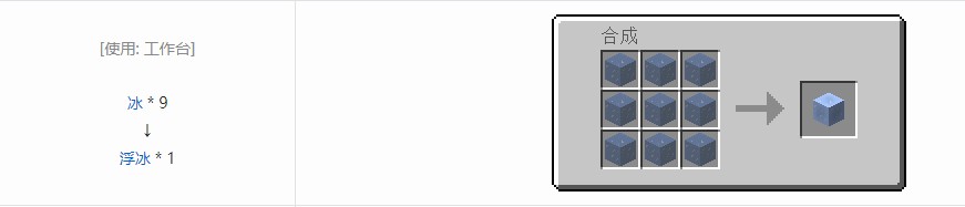 我的世界游戏里面的浮冰合成方法:可使用9块冰合成获得,每次合成时获得1个,浮冰有些滑,因此会让实体和物品也会滑动。在水流下面放浮冰来增加速度也是允许的。