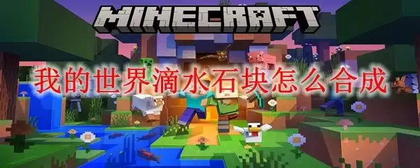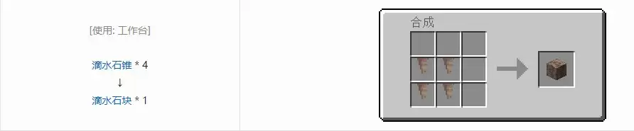 我的世界游戏里面的滴水石块合成方法:4个滴水石锥可以获得1个滴水石块,当滴水石块上方有水且下方有滴水石锥时,滴水石锥可以在其下缓慢地生长。