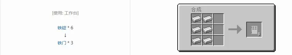 我的世界游戏里面的铁门合成方法:6个铁锭可以获得3个铁门,铁门拥有木门的功能,但是无法用手打开,需要红石信号激活才可以使门打开,铁门只能够使用红石信号开启(一个按钮、一个红石电路等)。
