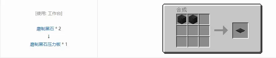 我的世界游戏里面的磨制黑石压力板合成方法:2个磨制黑石可以获得1个磨制黑石压力板,用磨制黑石合成的压力板,只能探测玩家和生物,可输出15级红石信号。