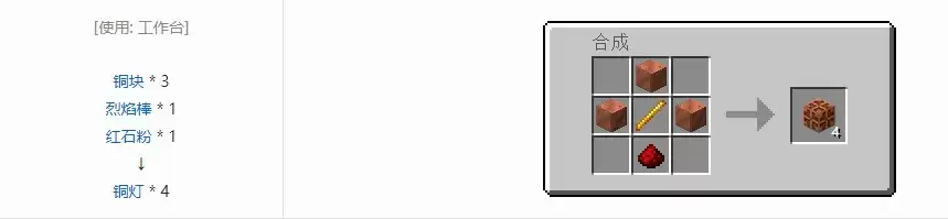 我的世界游戏里面的铜灯合成方法:需要材料3个铜块+1个烈焰棒+1个红石粉可以获得四个铜灯,是一种能在被红石信号激活后改变开关状态,且会随时间氧化的照明方块。