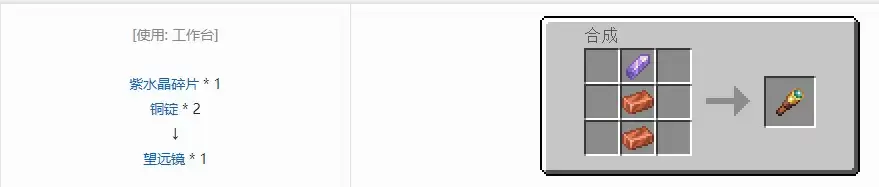 我的世界游戏里面的望远镜制作方法:可以用1个紫水晶碎片和2个铜锭合成,望远镜用于放大玩家视野中的特定位置,手持望远镜并按下使用键会打开望远镜,松开按键会关闭望远镜。