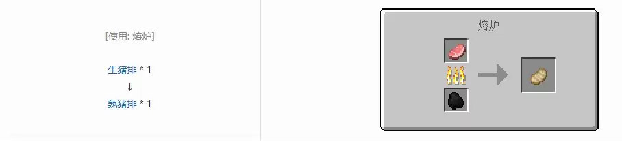 我的世界游戏里面的熟猪排制作方法:1个生猪排通过熔炉烧制可以获得1个熟猪排,熟猪排也可在堡垒遗迹中塔尖和疣猪兽棚的箱子中找到,熟猪排能用来治疗或繁殖驯服的狼,加快幼狼的生长速度。