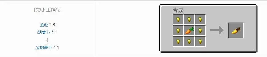 我的世界游戏里面的金胡萝卜合成方法:需要材料8个金粒+1个胡萝卜获得1个金胡萝卜,长按鼠标右键能吃金胡萝卜,每个金胡萝卜可以为玩家回复6点饥饿值和14.4饱和度。