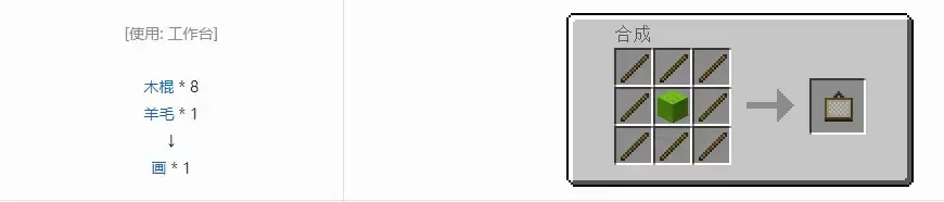 画可使用 8 根木棍和 1 块羊毛合成获得,每次合成时获得 1 个。