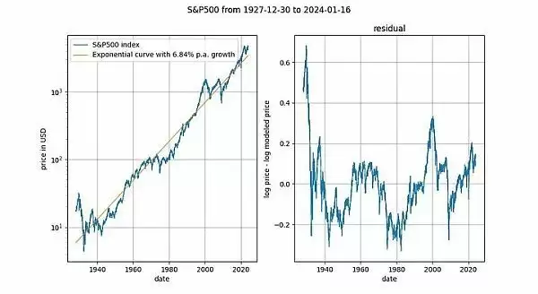 观察长期股价指数与时间的对比也很有趣(此处为不含红利再投资的标准普尔 500 指数)。众所周知,主要股票市场指数平均以 7% 左右的指数速度增长。事实上,我们通过指数回归也证实了这一点。