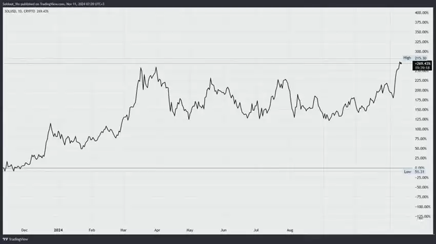 这种乐观预期并非空穴来风。SOL在过去一年表现出色,涨幅高达269%,远超同期大多数其他加密货币。这主要得益于市场情绪的推动,以及比特币减半后市场抛售带来的相对优势。