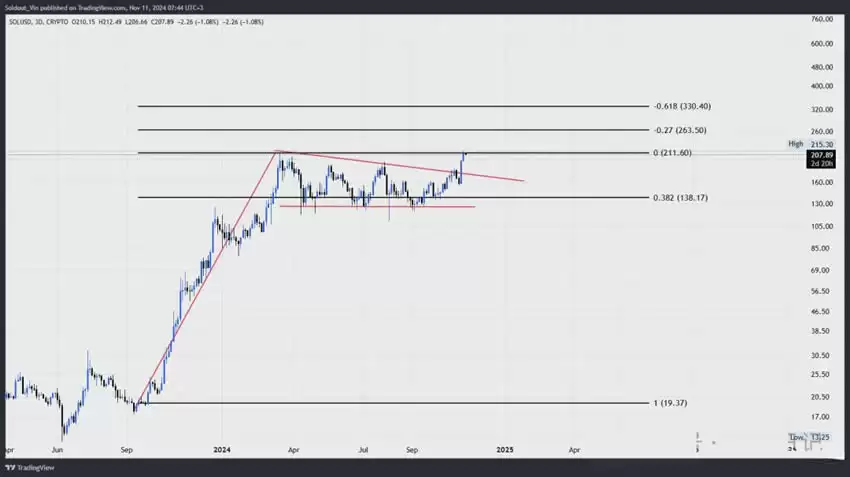 然而,在冲击1000美元之前,SOL价格可能面临多个阻力位。技术分析显示,211美元(年度高点)、263美元和330美元等价位可能成为阻碍。其中,263美元和330美元分别对应斐波那契扩展的27%和61.8%水平。