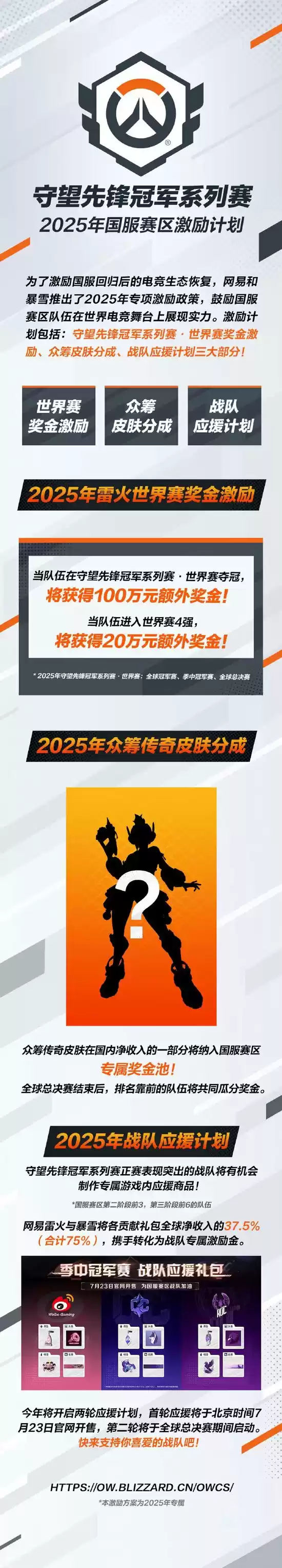 为激励国服回归后的电竞生态恢复,网易和暴雪推出了2025年专项激励政策,鼓励国服赛区战队在世界电竞舞台上展现实力。计划包括世界赛奖金激励、众筹皮肤分成、战队应援计划三大部分。