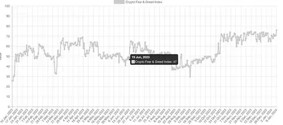 加密货币恐慌与贪婪指数,它综合考虑了六个关键的市场表现指标:波动性、市场动能和成交量、社交媒体情绪、调查结果、比特币的主导地位以及市场趋势。通过对这些指标进行加权平均,该指数能够较为准确地反映出当前市场的整体情绪。