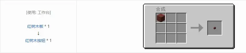 我的世界游戏里面的红树木按钮制作方法:需要材料1个红树木板可以获得1个红树木按钮,要激活一个已放置的按钮,使用放置键。木质按钮也会被射出去的箭激活。