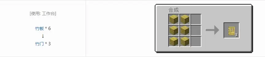 我的世界游戏里面的竹门合成方法:需要材料6个竹板可以获得3个竹门,可以使用红石信号进行控制开启和关闭,也可被玩家和村民开启和关闭。