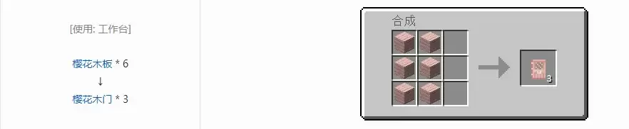 我的世界游戏里面的樱花木门制作方法:需要材料6个樱花木板可以获得3个樱花木门,木门是一种可开关的屏障方块,它可以通过合成获得,也会自然生成于建筑之中。