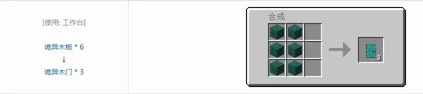 我的世界游戏里面的诡异木门制作方法:需要材料6个诡异木板可以获得3个诡异木门,可以被任何道具或徒手破坏并掉落本身,使用斧子是较快的选择。