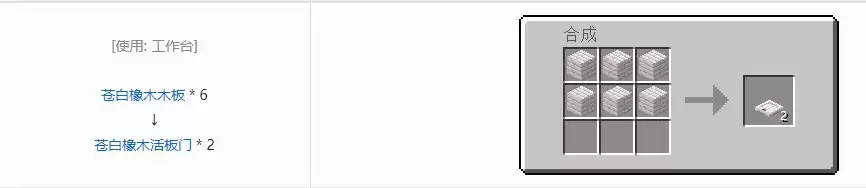 我的世界游戏里面的苍白橡木活板门制作方法:需要材料6个苍白橡木木板可以获得2个苍白橡木活板门,活板门能够在玩家或生物在活板门里面的情况下被开启或关闭。