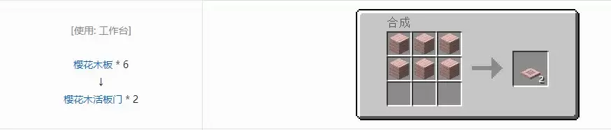 我的世界游戏里面的樱花木活板门制作方法:需要材料6个樱花木板可以获得2个樱花木活板门,水和熔岩流动时会绕过活板门,熔岩能在木质活板门旁的空气方块燃起火焰。