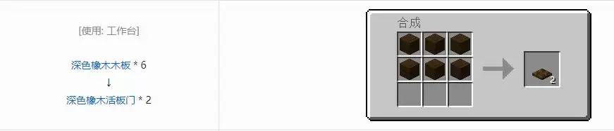 我的世界游戏里面的深色橡木活板门制作方法:需要材料6个深色橡木木板可以获得2个深色橡木活板门,活板门是一个可开关的屏障,能限制实体运动。