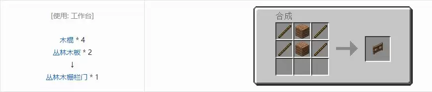 我的世界游戏里面的丛林木栅栏门建造方法:需要材料4个木棍+2个丛林木板可以获得1个丛林木栅栏门,只有当底下的方块是固体方块时,栅栏门才能成功放下;但在放下栅栏门后,移除底下的固体方块不会对栅栏门产生影响。
