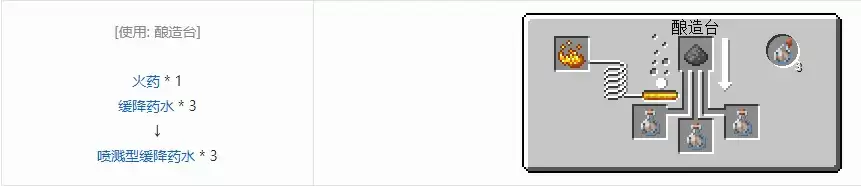 我的世界游戏里面的喷溅型缓降药水制作方法:需要材料1个火药+3个缓降药水可以获得3个喷溅型缓降药水,效果强度和时间由药水种类决定,且砸中的地方远近不同提供的药水持续时间也不同。