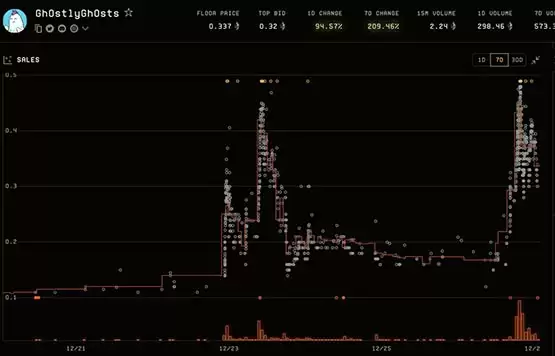 虽然$BOO的具体分配方案和细节尚未公布,但官方已经明确表示,NFT持有者的快照尚未拍摄。这意味着,持有者仍然有机会获得潜在的空投。在这样的预期下,Gh0stly Gh0sts的地板价也从0.17一路飙升至最高0.48,涨幅高达182%!