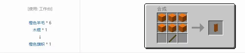 我的世界游戏里面的橙色旗帜制作方法:需要材料6个橙色羊毛+1个木棍可以获得1个橙色旗帜,用地图右击旗帜,可以在地图上添加一个标记,标记颜色与旗帜底色相同。