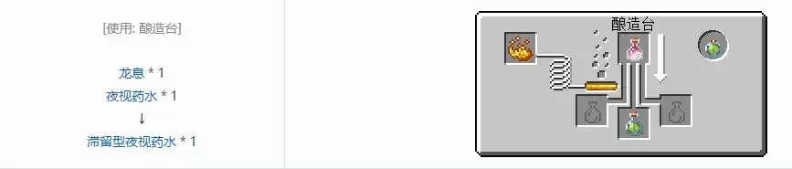 我的世界游戏里面的滞留型夜视药水制作方法:需要材料1个龙息+1个夜视药水可以获得1个滞留型夜视药水,会生成类似末影龙龙息的粒子效果(颜色取决于药水颜色)。