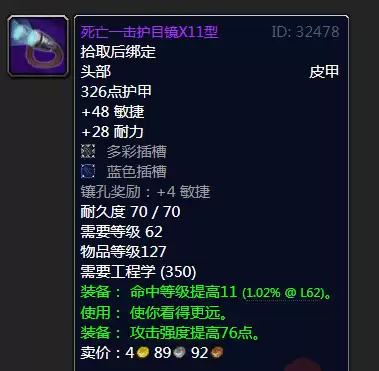 ③死亡一击护目镜X11型:盗贼专属的工程头,提供了高攻强高敏捷的属性,盗贼在tbc时期。1敏捷可以换成1攻强2敏捷可以换算成1暴击,所以这件装备对于盗贼来说提升了124点攻强24点暴击11点命中,前期盗贼穿上它,打副本还是打怪都像吃饭一样简单。