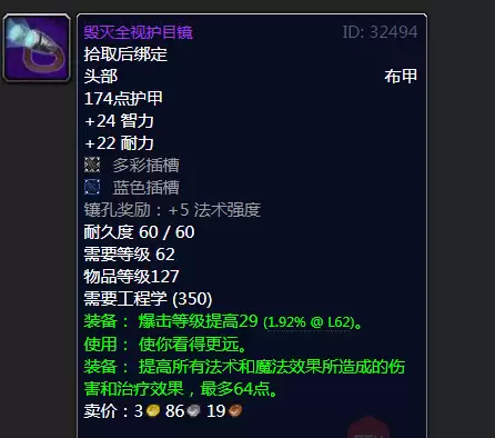 ①毁灭全视护目镜:高达64点法伤以及29点暴击,属性方面以及完全超越了法伤和术士的t4头,而且这个装备62级就能带了,用这个装备去练级效率也会大大提升。当然前期制造这件装备是需要不少材料的,尤其是氪金能量核心,需要3个氪金锭外加一个源生火焰,前期能做得起的都是土豪玩家。
