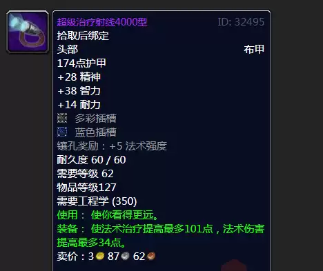 tbc时期工程制造的极品头盔,62级就能穿超过t4级别的头盔,除了工程没谁了。